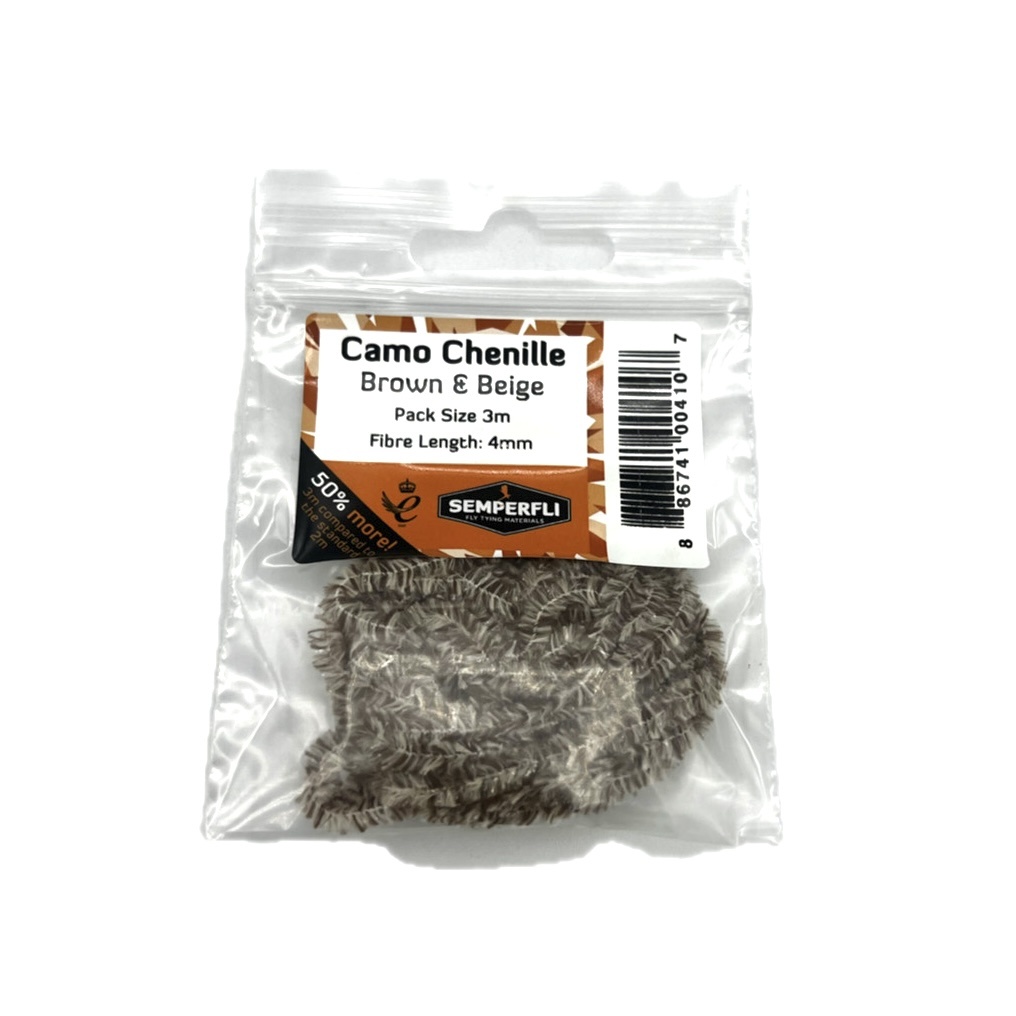 Camo Chenille 4mm Small from Semperfli is a unique 100% recycled polyester chenille which behaves much the same as hen feathers with lots of mobility.